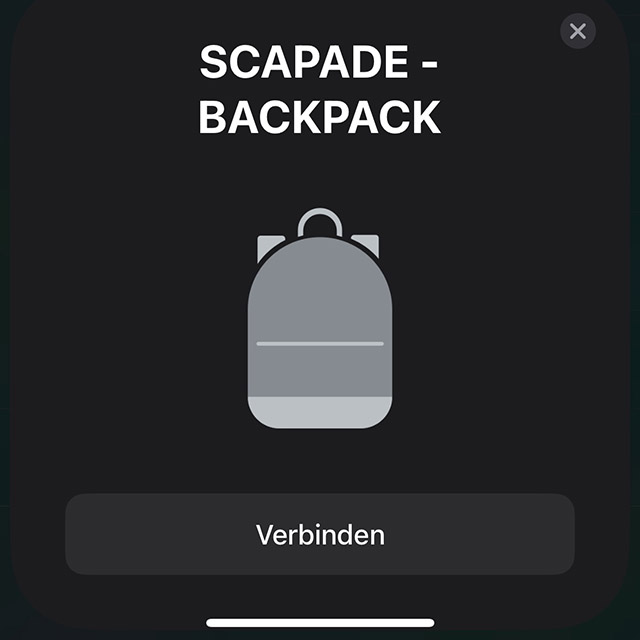 Ich nehme für den Test den Scapade Airpack Backpack mit in den Alltag: U-Bahn-Fahren zum Sport, mit dem Auto ins Wochenende, Pressetermine, Kundenbesuche, XXL Shopping-Tag in der Stadt. Dafür verbinde ich zunächst den eingebauten Tracker mit meiner „Find My“-App auf dem iPhone. Das klappt erwartungsgemäß völlig ohne Probleme.