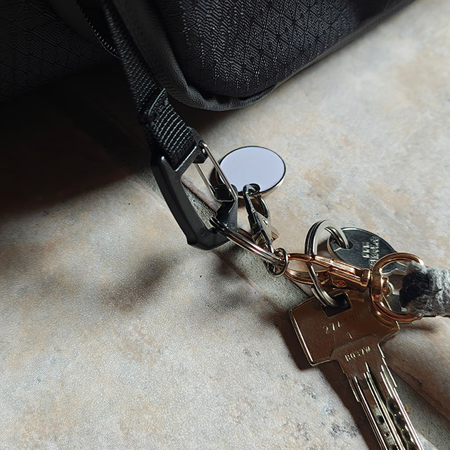 Das andere seitliche Außenfach ist unterteilt mit Netzfach sowie Schlüsselhaken. Beide Seitenfächer schließt man jeweils mit einem Zipper, der sich unter einer Lasche zusätzlich sichern lässt. Taschendiebe haben so weniger Chancen. Das zentrale Außenfach hat aber leider keine Sicherungslasche.