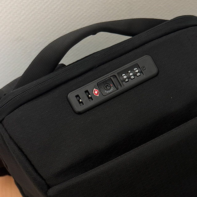 Der doppelte Zipper zum Hauptfach lässt sich an der Oberseite des Rucksacks in einem TSA-Nummernschloss sichern. Auf den ersten Blick ist das aber nicht zu sehen. Denn eine Magnetschließe deckt alles ab.