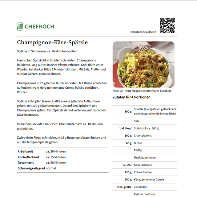 Wenn du vor allem Inspiration suchst und eine große Auswahl an lokalen Rezepten bevorzugst, solltest du Chefkoch.de ausprobieren. Viele Rezepte lassen sich als PDF herunterladen, und zwar ohne Anmeldung und Kosten (Drucken als PDF abspeichern). Mehr Rezeptideen, Import von anderen Webseiten und Wochenplaner gibt es aber nur in der Plus-Variante.