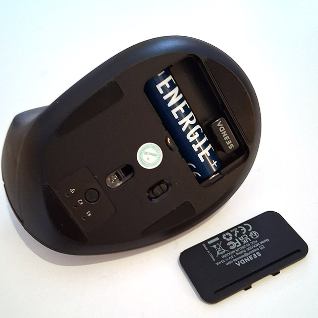 Die Vertikalmaus von Seenda ist batteriebetrieben. Das ist kein Beinbruch, da mit einer AA-Zelle laut Hersteller 150 Stunden Betrieb und bis zu 300 Tage-Stand-by möglich sind. Trotzdem hätte mir ein Akku besser gefallen, zumal der Hersteller mehrere wiederaufladbare Mäuse im Programm hat.