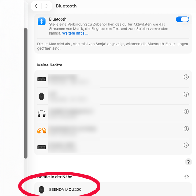 Die Seenda MOU200 ist eine vertikale, kabellose Maus, die sich über Bluetooth oder 2,4 GHz Funk verbindet. Du kannst sie mit zwei Geräten gleichzeitig koppeln – zum Beispiel Windows Laptop und Mac Mini (wie ich es gemacht habe). Das ist praktisch, wenn Du im Homeoffice arbeitest oder mehrere Geräte nutzt.