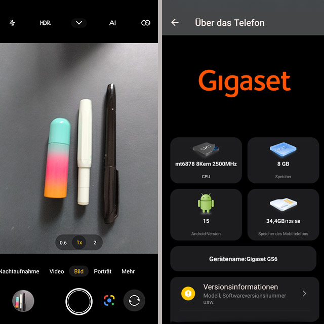 Das Gigaset GS 6 aus dem Test kann außerdem Bluetooth 5.4, Wifi 6e sowie NFC, ist also Google Pay-fähig. Es hat aber keinen Kopfhörer-Anschluss mehr.