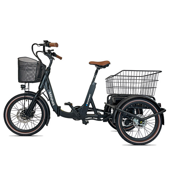 Mit StVZO‑konformer Ausstattung inklusive Licht, Reflektoren, Schutzblechen und zwei Körben eignet sich Minna besonders für den sicheren Transport von Einkäufen und Gepäck. Die neue Rahmenkonstruktion reduziert das Gewicht inklusive Akku auf 42 kg, bleibt dabei stabil und ermöglicht dank Schwenkmechanismus eine höhere Wendigkeit. Ergänzt wird das Update durch einen kompakten 36‑V‑Frontmotor mit 50 Nm Drehmoment, einer 3‑Gang‑Shimano‑Nexus-Schaltung und einer stärkeren Hinterradbremse.