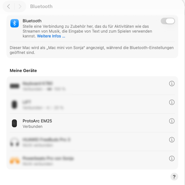 Über Bluetooth konnte ich meinen Windows PC sowie den Mac Mini (MacOS Tahoe) verbinden. Theoretisch wäre auch noch ein weiteres Gerät über den Wireless-Dongle möglich. Der Wechsel funktioniert mit der kleinen Kanal-Taste an der linken Seite der Maus.